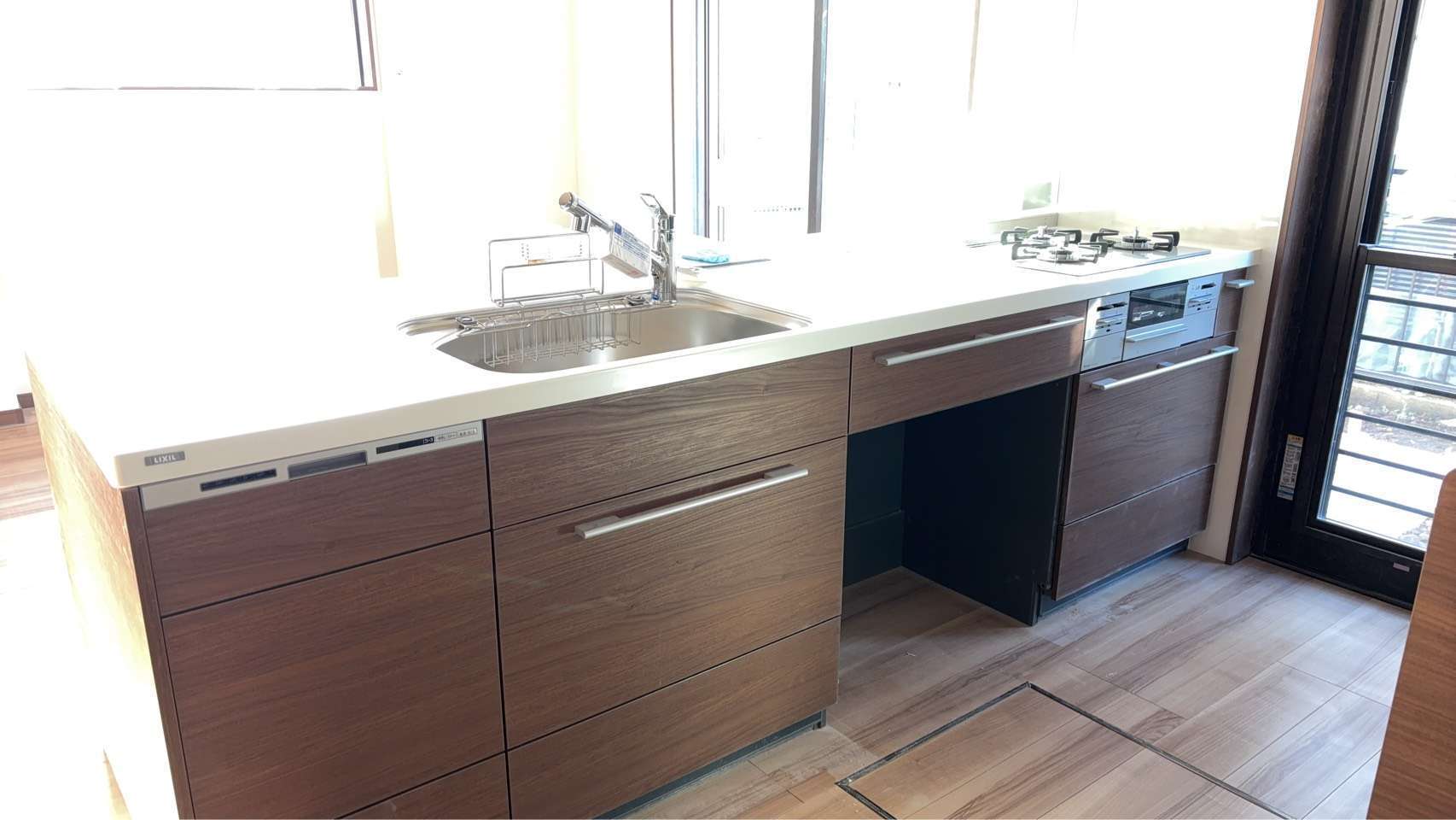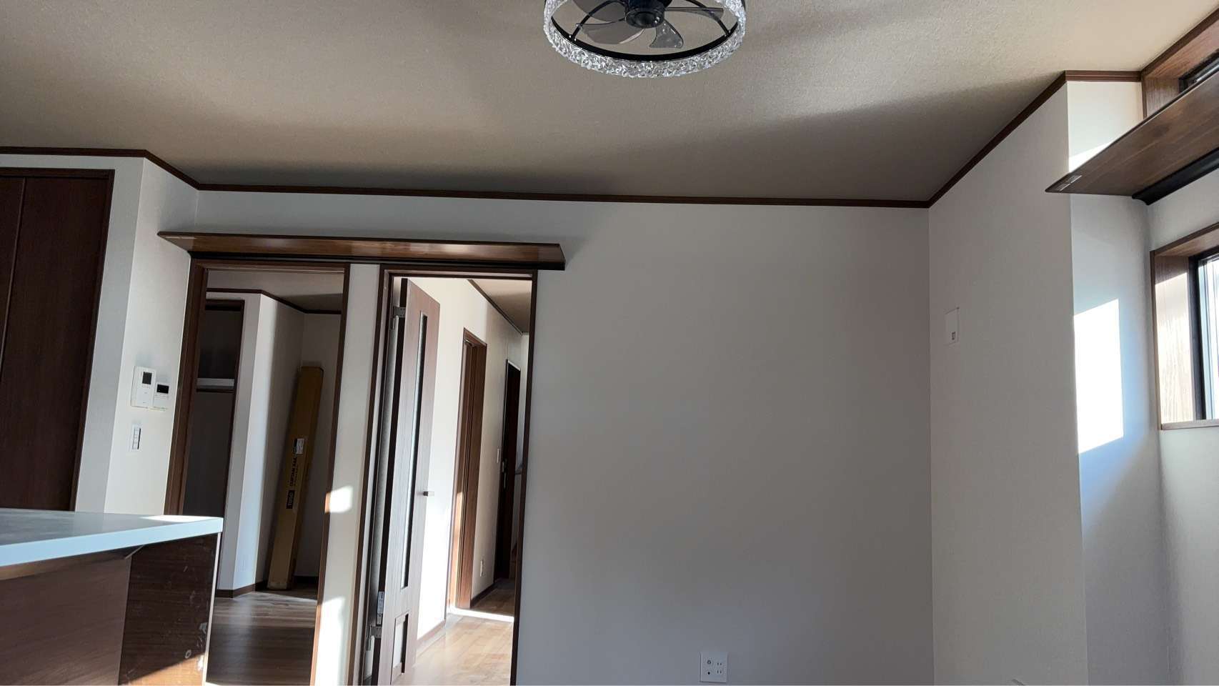 キッチンには、重厚感のあるダークウォールナット調のLIXIL製システムキッチンを採用。リビング側の建具やフローリングと色味を統一することで、新座市の閑静な住宅街に馴染む、モダンでシックな内装を実現しました。 対面キッチンには「全面ガラスパネル」を設置し、油はねを防ぎつつ視界を遮らない工夫を施しています。また、シンク下にはゴミ箱や家電を収納できるオープンスペースを設けることで、生活感が出やすいキッチン周りをすっきりと保てるようになりました。 リビング天井にはシーリングファンを設置し、デザイン性の向上だけでなく、室内の空気を効率よく循環させることで、一年を通して快適に過ごせる空間が完成しました。